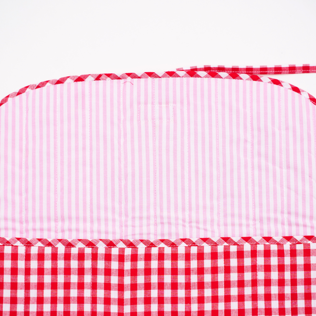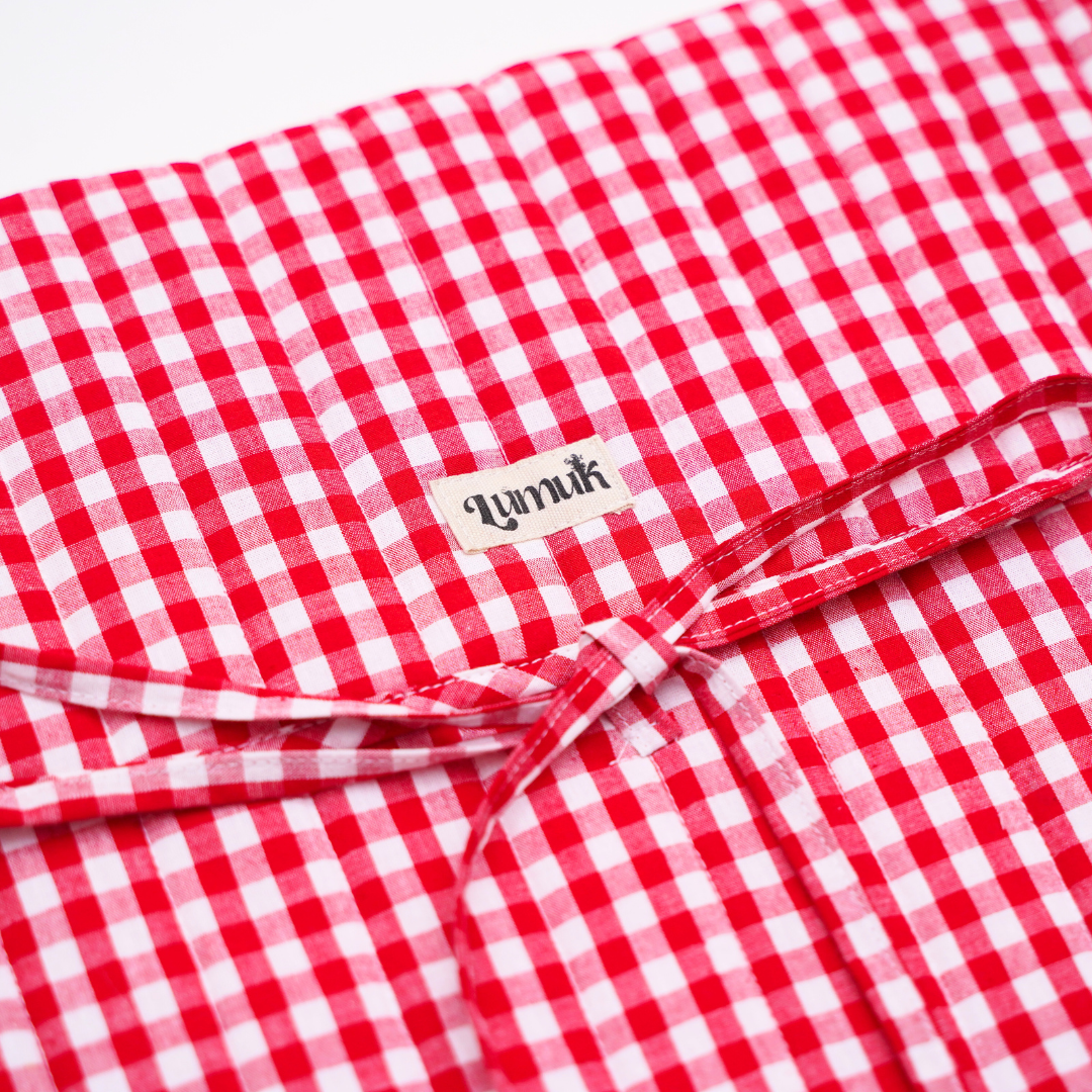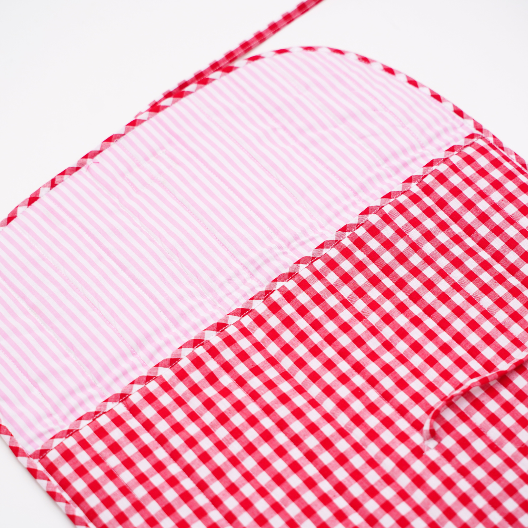 - Quilted cotton laptop sleeve in vibrant red gingham with a charming bow/tie-up flap closure—cute, secure, Pinterest-worthy.