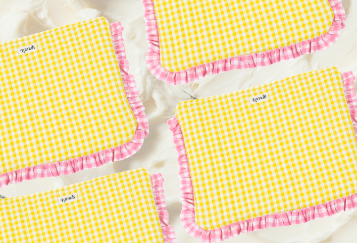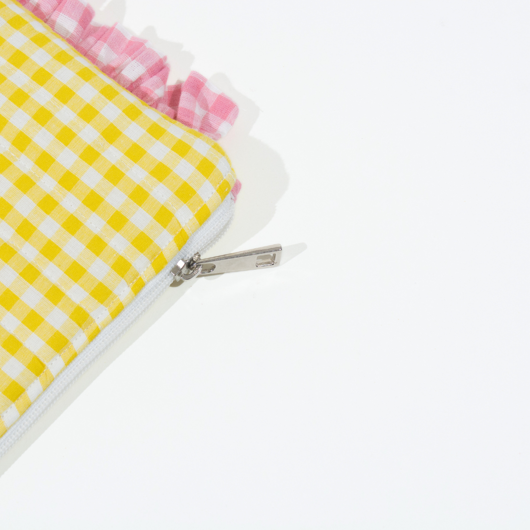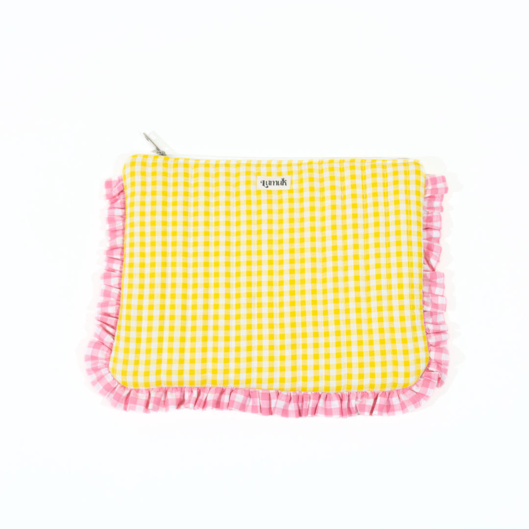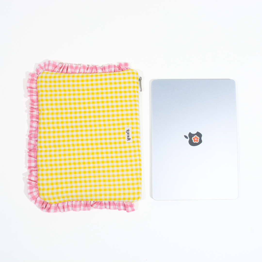 - Quilted cotton laptop sleeve in fresh yellow gingham with a contrasting pink ruffle border- cute, protective, Pinterest-worthy.