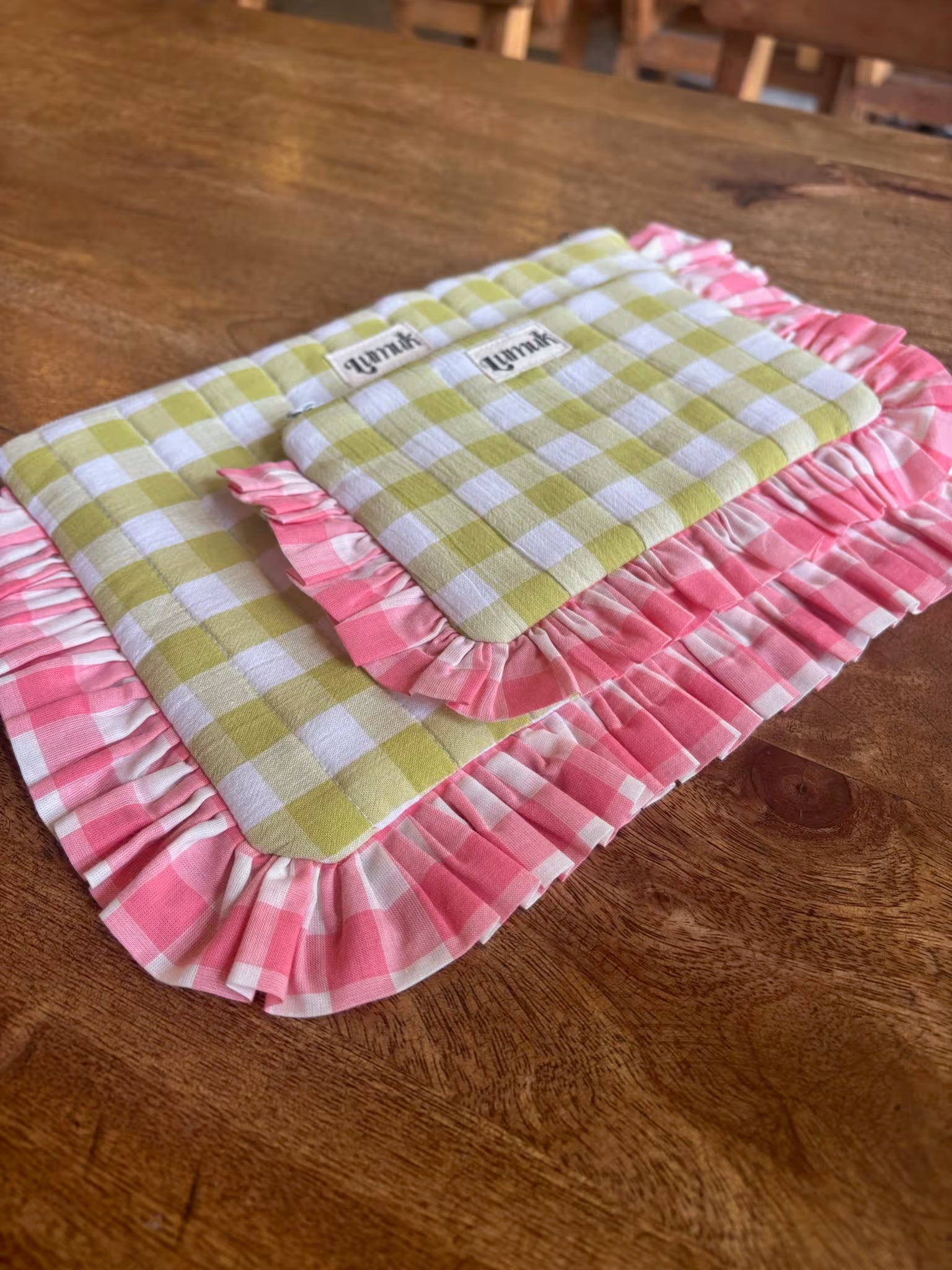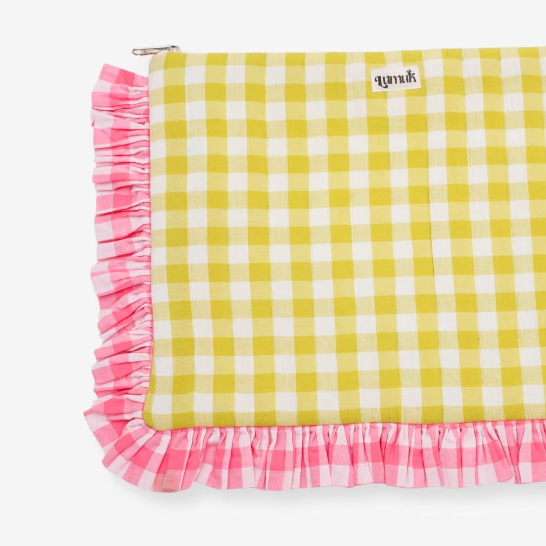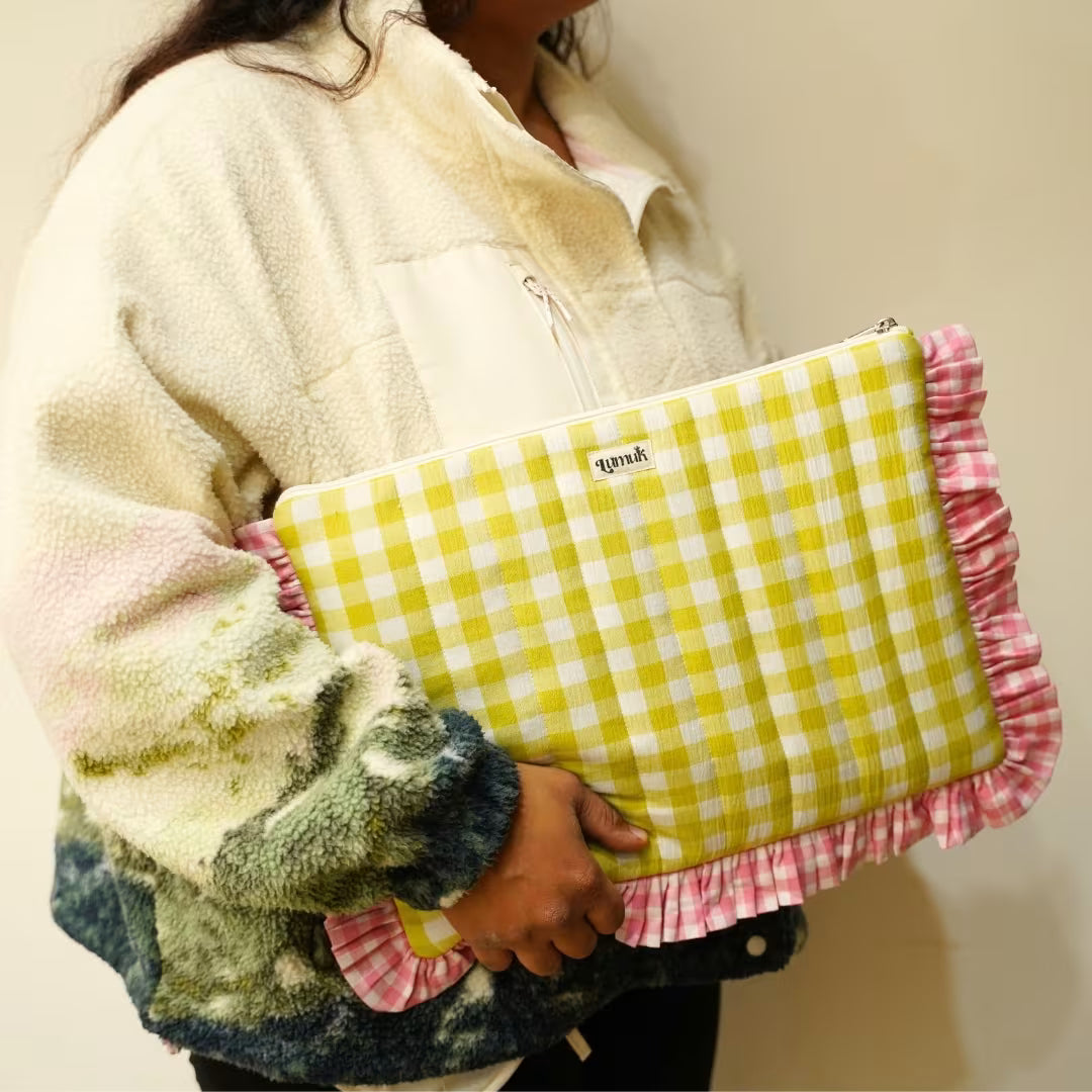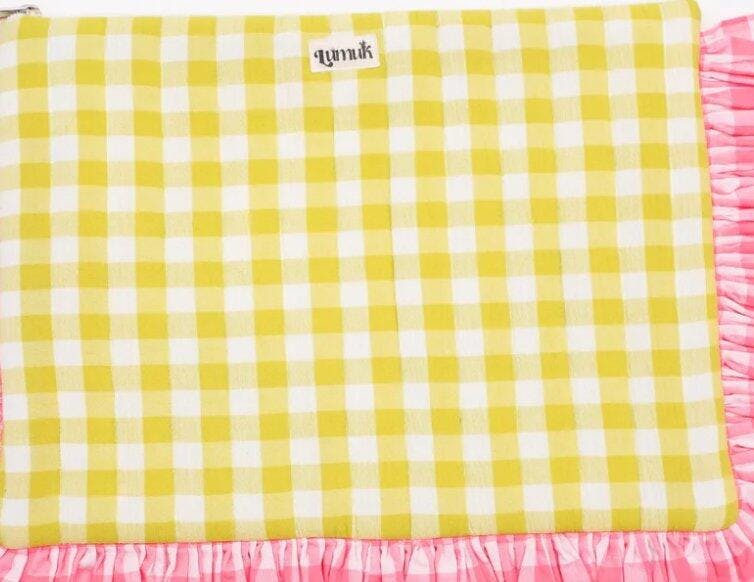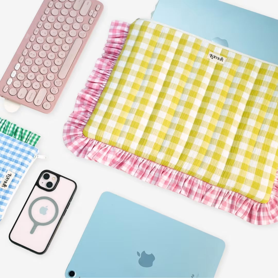 - Quilted cotton laptop sleeve in fresh yellow gingham with a contrasting pink ruffle border—cute, protective, Pinterest-worthy.