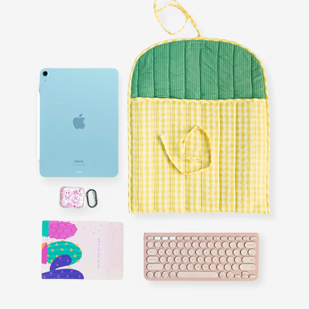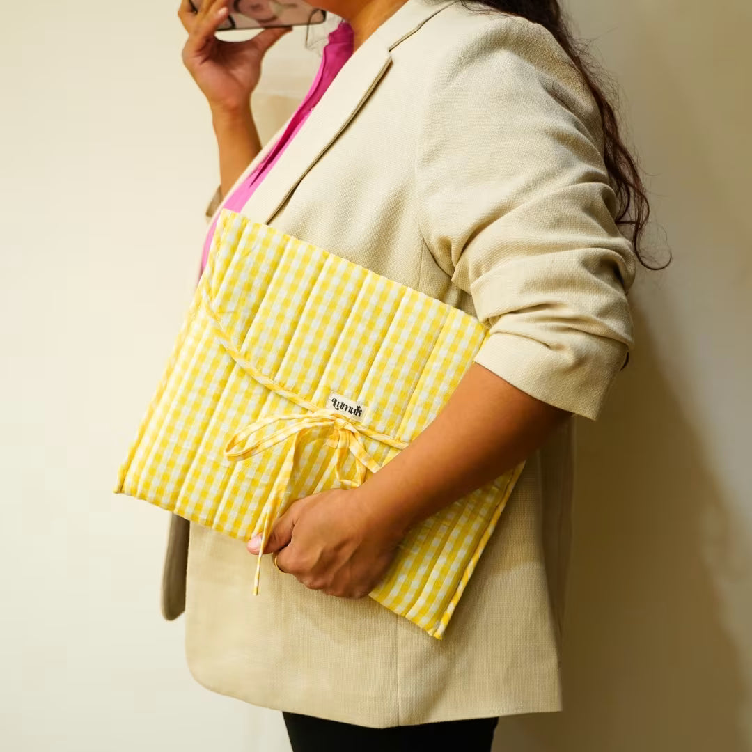 - Quilted cotton laptop sleeve in cheerful yellow gingham with a charming bow/tie-up flap closure—cute, secure, Pinterest-worthy.