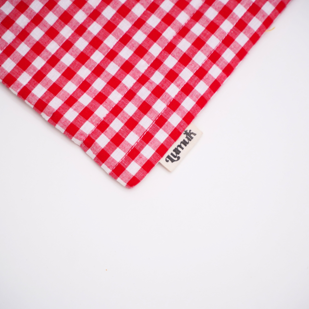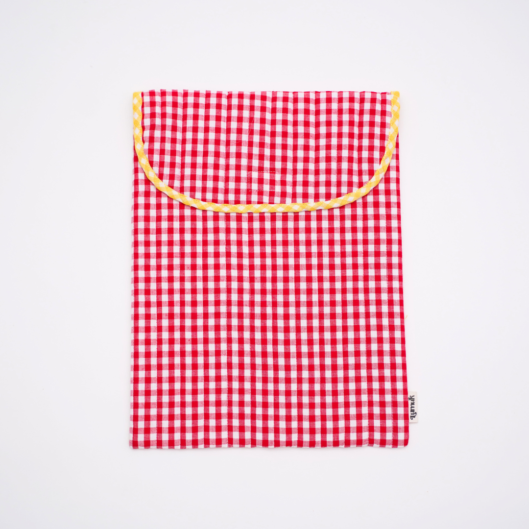 - Quilted cotton sleeve in bright red gingham with contrast yellow piping—cute, functional, Pinterest-worthy.