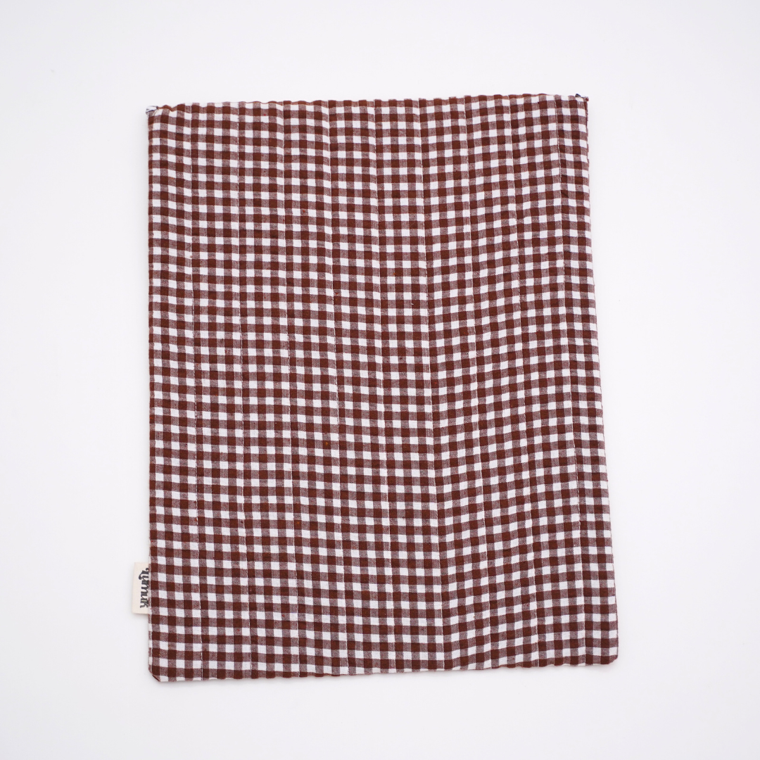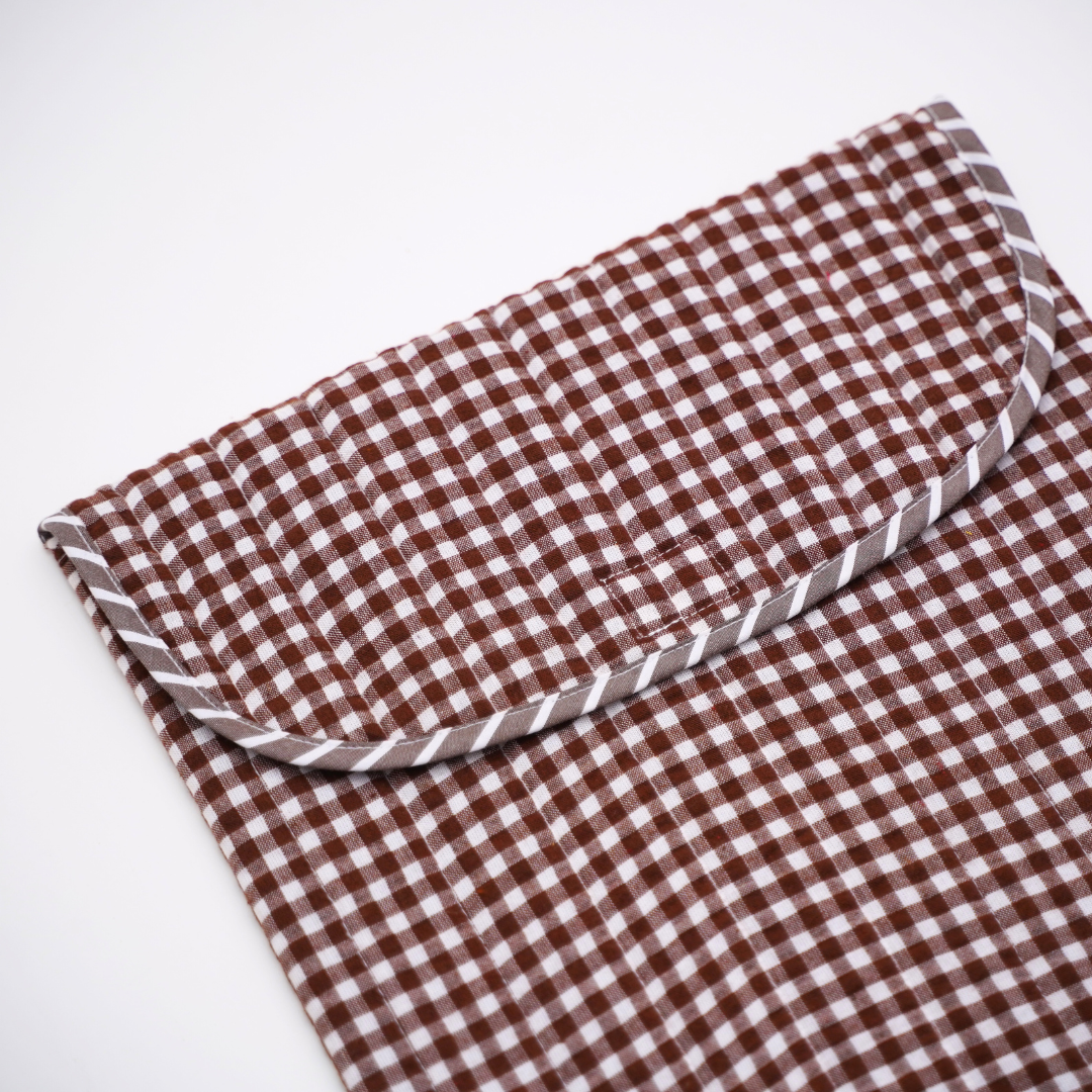 - Quilted cotton device sleeve in classic brown gingham with contrast striped piping—minimal, chic, Pinterest-worthy.