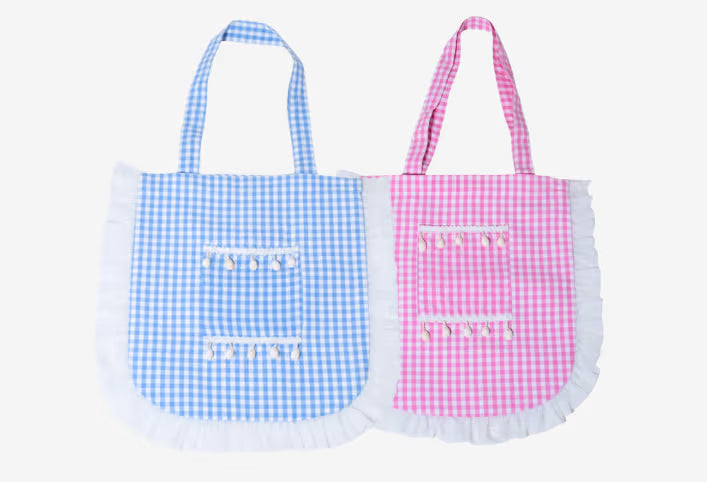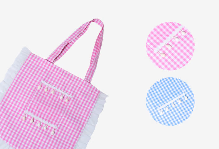 A gingham tote bag in calming tones, Finished with soft gathered edges that add a playful touch while keeping the look timeless