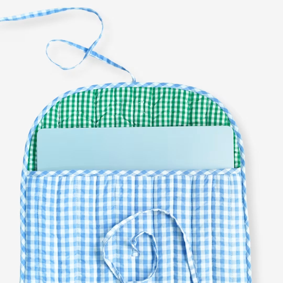 - Quilted cotton laptop sleeve in soothing sky-blue gingham with a cute bow/tie-up flap closure—secure, stylish, Pinterest-worthy.