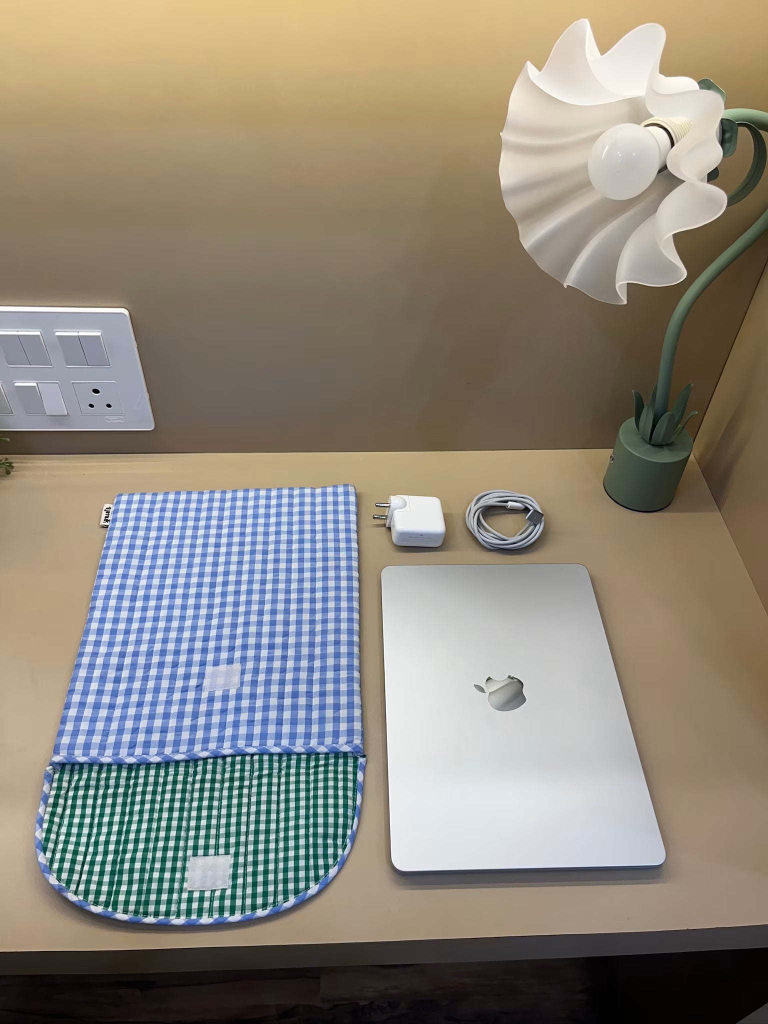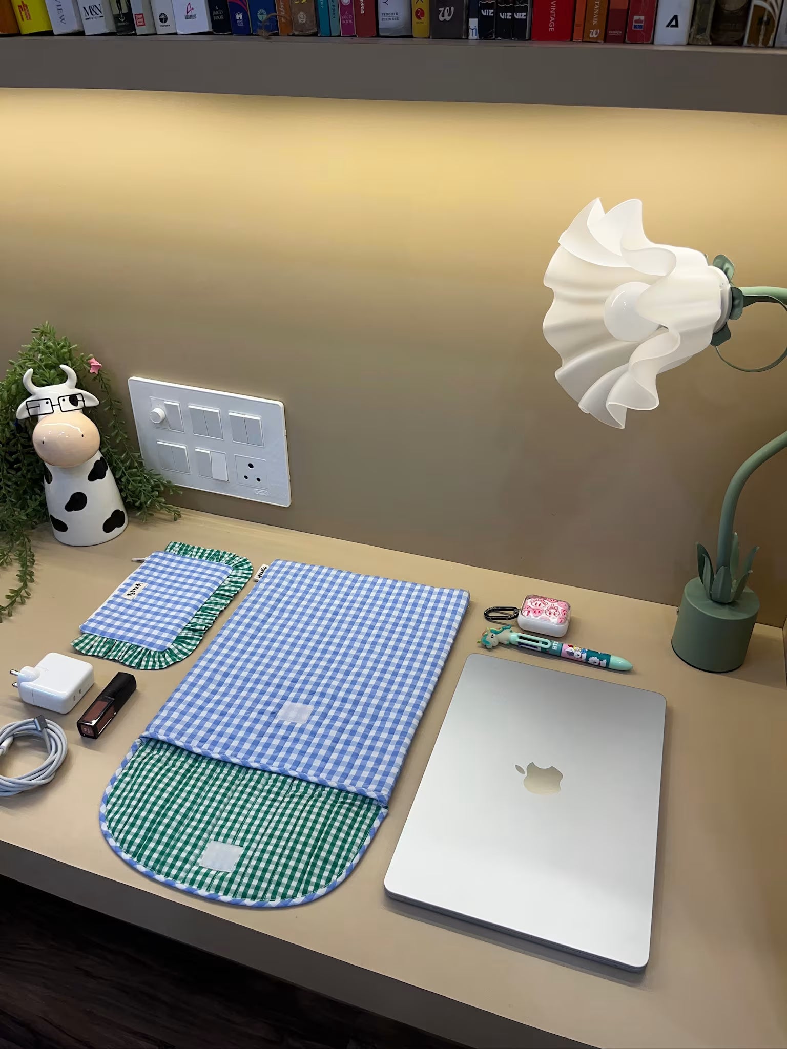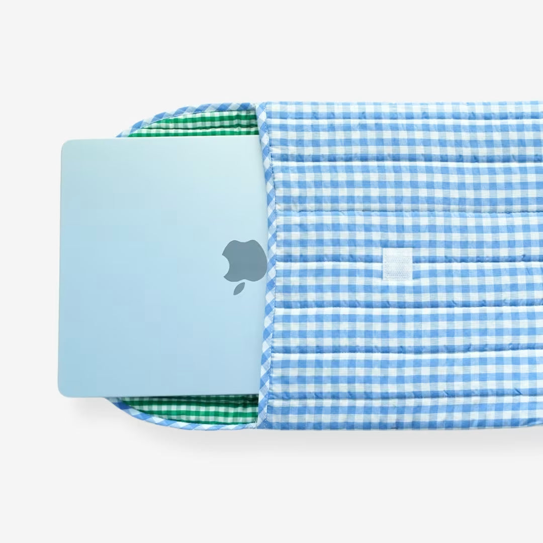 - Quilted cotton device sleeve in soft sky-blue gingham with matching piped flap—clean, cute, Pinterest-worthy.