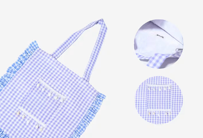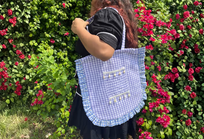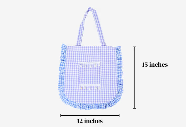 A gingham tote bag in calming tones, Finished with soft gathered edges that add a playful touch while keeping the look timeless