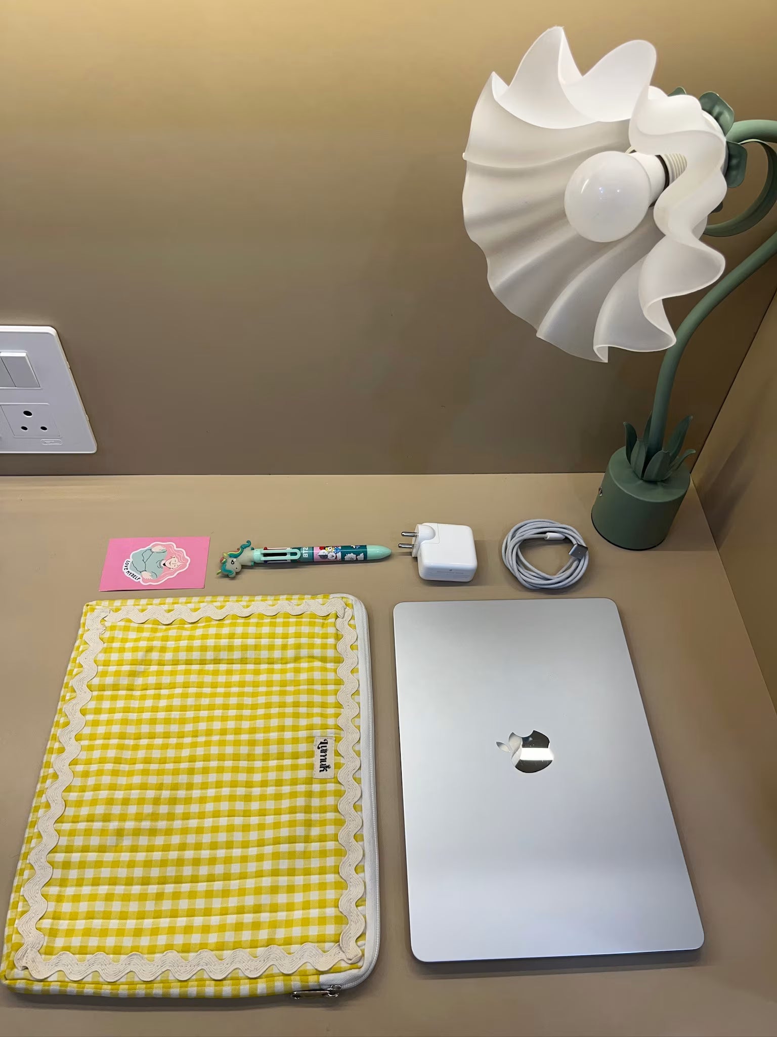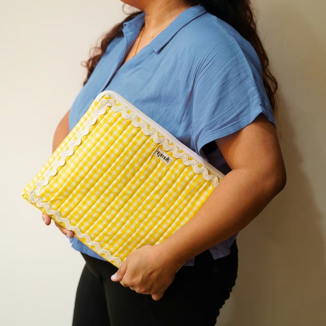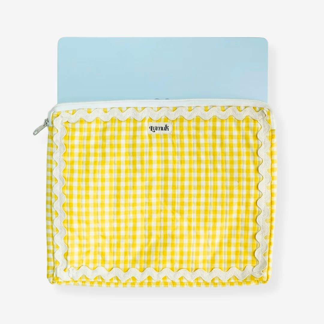 - Quilted cotton laptop sleeve in cheerful yellow gingham with signature ric-rac (zigzag) trim—cute, functional, Pinterest-worthy.